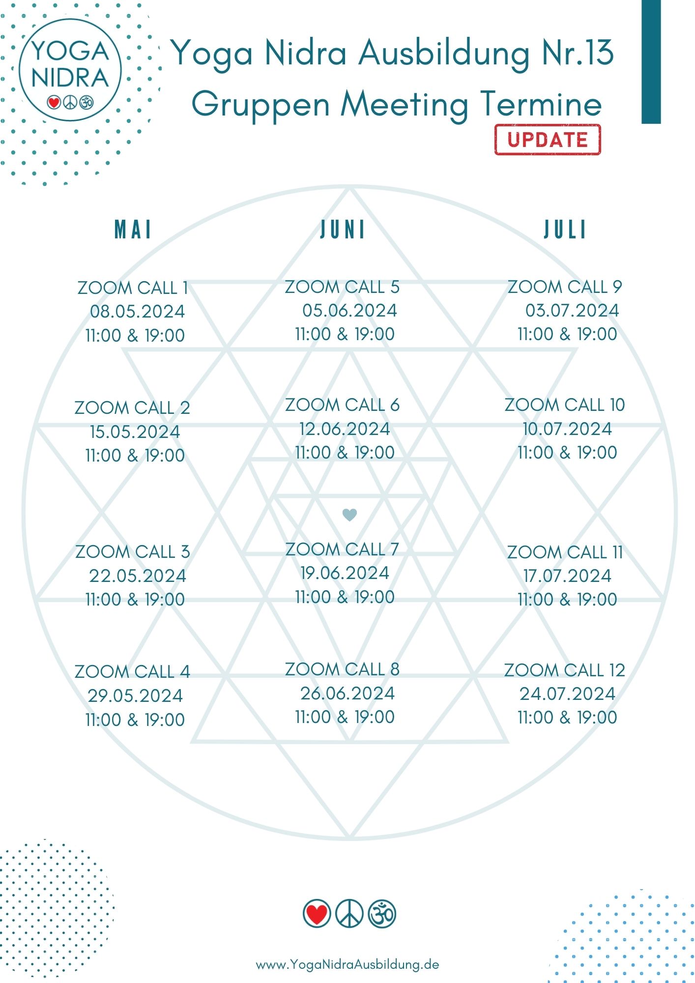 - Alle drei Monate treffen sich die Yoga Nidra Lehrer:innen aller Ausbildungen zum Erfahrungsaustausch und zur Unterstützung. Diese Treffen bieten Raum für Fragen, Projektvorstellungen und gegenseitige Unterstützung.